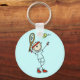 Um tênis de boné macho em um chaveiro Tênis com Stick Figure Men com um fundo azul claro.