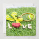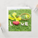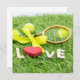 Tênis e raquete sobre grama verde com cartão plano amoroso