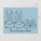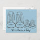 O cartão postal apresenta um par de tênis tamanho adulto ao lado de um par de tênis tamanho infantil. Perfeito para anunciar sua nova chegada! Versão para menino (fundo azul) e versão para menina (fundo rosa) e adesivos correspondentes também disponíveis. O texto também pode ser personalizado para chás de bebê e anúncios de nascimento.