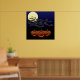 Três lanternas de Halloween com morcegos voadores sobre um fundo escuro iluminado pela lua.