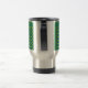Um alumínio, uma caneca de viagem à moda do não-derramar a personalizar, com um teste padrão de tender a luz - verde (tiros da proposta) e (bolinhas azuis escuro do azul de Monaco) em tamanhos de variação em um fundo do verde esmeralda.