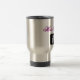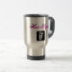 Caneca de café de aço inoxidável com tesouras e o gráfico preto e branco do pente. A escrita elegante do roteiro no rosa quente e no preto lê o "cabeleireiro". Presente fabuloso para um cabeleireiro, um estilista, ou um barbeiro