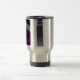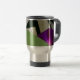 A imagem na caneca floral, de aço inoxidável da viagem ao trabalho é um wildflower cor-de-rosa-roxo da corriola sob uma folha, quando outras folhas moldarem sombras em uma cerca de madeira.