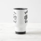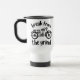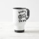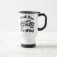 Uma caneca de viagem com uma motocicleta retrô monocromática, com a frase "Quebre a Rotina" centrada em torno da imagem. O design sugere um senso de aventura e liberdade, oferecendo uma fuga pacífica da rotina diária.