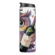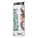 Essa ilustração gráfica peculiar apresenta uma coruja estilizada com olhos grandes e expressivos e penas abafadas, segurando uma garrafa de vinho com seu talão. O texto à esquerda diz: "NÃO TIRE ACONSELHAMENTO DE MIM VOCÊ SÓ TERÁ BEBADO." A arte tem um tom divertido, caprichoso e muito humorístico.