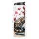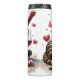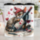 Esta imagem humorística apresenta um gato ranzinza vestindo um gorro vermelho, abraçando uma grande garrafa de vinho. Uma taça de vinho se senta sobre uma mesa de madeira ao lado dela, junto com uma nota e uma caneta. Corações vermelhos flutuantes e uma mensagem sarcástica na nota acrescentam ao tema engraçado do Dia de os namorados, contrastando os elementos românticos com a expressão rabugenta do gato.
