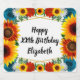 Design floral elegante e colorido para um evento de verão no quintal. Apresenta rosas azuis, margaridas brancas, flores silvestres vermelhas e girassóis com quadro geométrico dourado