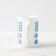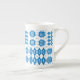 Uma caneca de café chique de China de osso, com um teste padrão de motivos tradicionais da tapeçaria de Galês no azul brilhante em um fundo branco. Este teste padrão caberá todos os tamanhos da caneca.