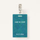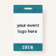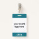 Personalize este simples crachá moderno de funcionarios da equipe de eventos voluntários com o seu logotipo. Se o seu logótipo for quadrado, preencherá inteiramente o espaço branco. Se o seu logotipo não estiver quadrado, aparecerá em um fundo teal. A parte traseira do crachá pode ser personalizada com o nome do evento e a data ou ano, ou você pode deletar ambos para ter uma textura de pintura completa de volta. Este crachá de funcionarios de tripulações minimalista é ideal para eventos especiais, festivais, concertos e convenções.