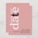 Um valor para o alternativo do ORÇAMENTO em tamanho menor de 4,5 x 5,6" de semirbrilho de 110 lbs, que é de espessura semelhante a um cartão postal (no entanto, não é adequado para uso como cartão postal). POR FAVOR, OBSERVE QUE HÁ UM convite por folha. Texto De Código QR Cor-De-Rosa Rosa De Dusty De Orçamento Salva A Data. Adicione seu código QR ao seu site de casamento no verso substituindo o código QR na amostra. Você pode criar códigos QR gratuitamente on-line. Basta pesquisar "Criador de código QR" e muitas opções surgem para criar gratuitamente. Um na moda tipográfico moderno para convidar sua família e amigos para salvar seu encontro, com a organização Save Our Date em grande tipografia rotacionada e para o lado esquerdo no topo em branco, com uma letra preta "t" sobre um fundo de cor-de-rosa-rosa pálido e empoeirado. Personalize facilmente o resto do texto.