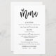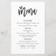 Texto do Script de Tendência do Orçamento Apenas Menu de Casamento. Um tamanho maior de 5,5" x 8,5" a um preço orçamentário, em um STOCK CARD SEMI GLOSS de 110 lb, excelente de convites, aproximadamente na mesma espessura de um cartão postal, ou um estoque LINEN elegante de 110 lb - para um luxo, ligeiramente mais fino, com um valor de excelente. OBSERVE QUE OS ENVELOPES OPCIONAIS SÃO UM POUCO MAIORES EM TAMANHO A 6,75" x 9" aprox. Este alternativo de tamanho de orçamento também está disponível em outras opções de papel. O papel FELT de 100 lbs é colorido por buff, NÃO branco, então adiciona um toque rústico. O estoque de papel MATTE de 80 lb é branco brilhante, para impressão nítida, excelente para seus menus e programas, enquanto o papel SATIN de 80 lb é fino e leve, ideal para gabinetes. Uma tipografia informal em preto para o título principal Menu que complementa o resto do texto que você pode facilmente personalizar.
