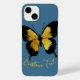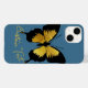 Borboleta apanhadora de olhos em design de voo com texto personalizado de cor de ouro para um nome ou mensagem. O design apresenta uma ilustração de uma borboleta com contraste de ouro amarelo brilhante e listras pretas. As asas se estendem, também nas mesmas cores preto e dourado. O texto personalizado está no estilo caligráfico, curvando em volta da borboleta em um ouro amarelo claro. Esta simples design de borboleta é colocada contra uma cor de fundo azul de denim.