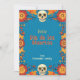 A "Eternal Blossoms Tribute Card" para o Dia de Muertos apresenta um fundo azul vibrante coberto por flores laranja e vermelha com dois crânios decorativos no topo e no fundo. O texto central diz "Feliz Dia de los Muertos" em negrito, amarelo, seguido de "de [nome personalizado]" indicando uma área de nome do remetente personalizável. A parte traseira do cartão provavelmente espelha a frente com espaço para uma mensagem personalizada contra o mesmo fundo floral azul.