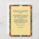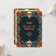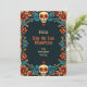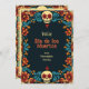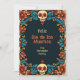 A "Eternal Blossoms Tribute Card" é uma placa de saudação plana do Dia de Muertos que apresenta uma borda vibrante com padrões florais e motivos cranianos em cores como azul, laranja e vermelho sobre fundo escuro. A frente do cartão exibe o texto "Feliz Dia de Los Muertos" em uma fonte grande e estilizada, seguida de "de [nome personalizado]", onde o nome do remetente pode ser personalizado. A parte traseira da placa oferece espaço para uma mensagem personalizada e continua a mesma borda decorativa e fundo que a frente para consistência visual.