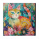 A vibrant cat with striking green eyes is surrounded by a lush array of colorful flowers and leaves. The use of bold hues like orange, teal, and pink creates a whimsical and enchanting scene.
