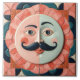 A square tile art piece featuring a stylized face split vertically into two distinct color schemes, the left side is pink, while the right side is a pale blue. The face has a prominent, dark blue mustache that curls upwards at the ends, and the lips are a muted coral color. Each side of the face has a single rosy cheek spot. The eyes are large and blue, with dark blue eyebrows arching above them.