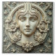 A bas-relief sculpture of a fair-skinned woman, around 25 years old, encased in a circular frame adorned with floral motifs. The woman has a symmetrical face, with almond-shaped eyes, a straight nose, and full lips. Her hair is styled in gentle waves, with a central parting and a decorative band across her forehead. The circular frame is embellished with stylized flowers and leaves.
