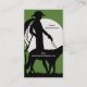 Uma silhueta à moda da forma do art deco da mulher e do cão ajustados contra uma lua branca brilhante, fundo macio-colorido com silhueta preta.