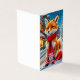 Ilustração de uma raposa antropomórfica alegre sentada na vibrante rua da cidade, agora transformada para a temporada de festas. A raposa, enfeitada com um lenço vermelho e um chapéu de Papai Noel, fede de alegria. O fundo urbano é pulverizado com neve branca e macia, criando uma atmosfera festiva e confortável. Os flocos de neve caem suavemente ao redor da cena, e as árvores que guardam a calçada são decoradas com luzes brilhantes e ornamentos coloridos. O carro vintage azul claro está agora decolado com uma coroa na frente, melhorando o charme caprichoso.