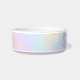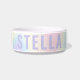 Tendy pet bowl com um fundo comum de arco-íris pastel macio e o nome do seu animal de estimação em roxo claro.