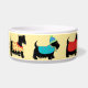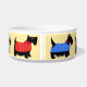 Personalize este prato de comida para animais de estimação para mostrar o seu amor pelos cães Terrier escoceses e personalize com o nome do seu cão no centro em um fundo amarelo. O design colorido tem 6 cães escoceses pretos num conjunto colorido de roupas de cão e em fundo vermelho. Estes uísques brancos, bonitos e adoráveis estão vestindo várias casacos ou camisetas coloridas de suéter de cachorro e um tem um chapéu de tobogã. As cores são vermelha, lavanda, roxa, amarela, azul-azul-turquesa, verde limão e laranja com estampas de pata, estrelas, listras, cheques e padrões com floco de neve. Estes cães brancos e de moda são arte original de Phyllis Dobbs e derreterão o coração de um amante de cachorro. Estes artigos de estimação são tanto individualmente como em blocos coloridos com fronteiras para coordenar produtos. Todos são perfeitamente personalizáveis para fazer isso seu!