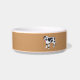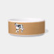 Pintura de um cão branco com manchas pretas, com a boca aberta e a língua pendurada, impressa três vezes em tigelas de animais de estimação. A faixa de cores pode ser personalizada.