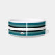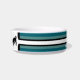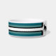 A tigela de comida branca de cão cerâmico com quatro faixas de tonalidade, branca e preta como base, e qualquer cor de coordenação que você escolher na opção "personalizar" (dentro da opção personalizar) aparecerá em dois tons. Mostrado aqui em um chalé, branco e preto.