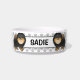 A ilustração original do desenho animado de Destei de um cão da raça Pomeraniana, preto e casaco bronzeado. Há também uma área de texto personalizável para um nome. O fundo tem um padrão de pegadas de cinza.