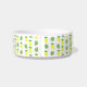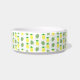 Esta incrível tigela de cachorro apresenta um padrão de frutas de abacaxi amarelo tropical com topos verdes e folhas bonito de palma verde-claro. Ideal para um Casamento Termal Tropical ou Verão. Há um círculo amarelo com padrões brancos marmoreados que contém texto personalizável para que você possa personalizar este design.