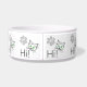 Olá, texto e desenhos de um rosto de gato com olhos verdes e uma pata. Saudações aos gatos. Uma tigela engraçada para animais de estimação ou gatos.
