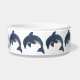 Esta tigela de comida para animais de estimação é circundada por um brilho bonito como golfinhos azul escuro com barrigas brancas em posições de salto que têm olhos giratórios pretos e brancos.