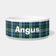 Xadrez tradicional azul, verde, cinzas, clã preto, amarelo MacNeil tartan, em torno desta tigela branca de cão cerâmico. O texto branco personalizado está pronto para personalizar com o nome do seu animal de estimação. Faz uma ideia de presente de excelente para um novo dono de cachorro.