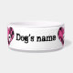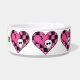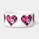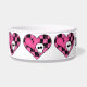 Um padrão de tabuleiro preto e rosa quente, adorável, com crânios e corações quebrados ao redor de uma tigela de cachorro com espaço para o seu nome de animal.