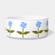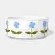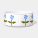 Esta incrível tigela de estimação apresenta uma imagem digital de uma margarida com um tronco verde com duas folhas verdes sobre ela e pétalas claras e azuis escuras. Esta é uma design simples, mas bonita. O fundo é branco.