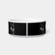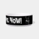 Tigela de comida para gatos preta e branca ilustrada com o texto 'Miau - Me alimente agora!'