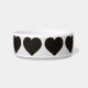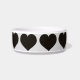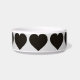 Esta tigela de alimentação de animais de estimação apresenta um padrão repetido de corações pretos em forma.