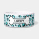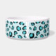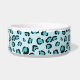 Esta tigela de estimação azul tem um padrão de impressão de leopardo criado digitalmente com um laço de cachorro que tem uma área de texto personalizável dentro dela para o nome do animal de estimação.