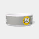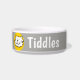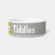 Adicione o nome do seu animal de estimação a esta tigela divertida que apresenta uma ilustração do estilo de desenho animado de um gato sorrindo. Cinza.