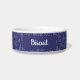 Pet bowl with a personalized dog name monogram in a cute script font paired with a pattern featuring digitally hand-drawn dog constellations and ditsy stars as a background. Check out our store for more matching items from this collection.