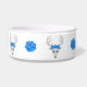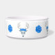 Esta tigela de comida de animais de estimação está cercada de fantasia com cabeças brancas de cervo com grandes galhos brancos, olhos azuis e rosas em suas cabeças. Bonito rosas azuis estão entre os veados.