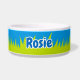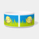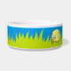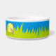Um desenho animado de pássaros amarelo giro e engraçado sobre a grama e fundo do céu. Texto personalizado.