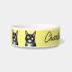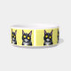 Gatinho preto bonito com olhos grandes e amarelos personalizados alimentando a tigela.