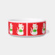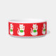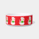 Esta tigela de gato espetacular apresenta uma imagem design gráfica de um gato oriental de acenar branco sortudo. O gato tem belos olhos de ouro e está vestindo um medalhão de ouro no colarinho ao redor do pescoço. O gato tem orelhas rosadas e sussurros. Este gatinho bonitinho está segurando um token de ouro com uma entrada de jade verde e uma mensagem no texto de ouro que diz "Boa Sorte".