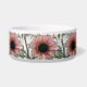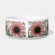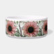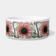 Esta incrível tigela de estimação mostra uma bela fotografia de um girassol rosa pálido. O girassol é naturalmente cor-de-rosa e as pétalas têm um anel exterior cor-de-rosa claro e um anel interior rosa escuro. O meio onde estão as sementes é preto. Esta fotografia foi tirada num jardim.