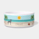 A ilustração original de um desenho animado italiano Greyhound de cor azul/cão da raça iggy em uma cena de praia tropical de verão. Na areia bege há uma palmeira, uma concha rosa junto com um starfish e um caranguejo vermelho. A água é azul turquesa com algumas ondas e o sol brilha acima do horizonte. Há também uma área de texto personalizável para um nome.