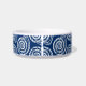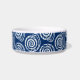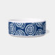 Pet bowl em um padrão de impressão de bloco, baseado em uma concha espiral, em branco sobre um fundo azul de cobalto