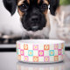 Linda, bonita e colorida! Esta tigela de cachorro com padrão de margarida é impressa com margaridas doces em um padrão de tabuleiro de xadrez multicolorido em creme, rosa, laranja e turquesa.