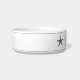 Uma tigela de cachorro de estilo costeiro bonito para sua casa de praia ou moradia insular exibe a palavra "cão de praia" em enfumaçado porto, em caracteres azuis, em letras de fundo branco, acentuadas com faixas estreitas de marinho e um par de estrelas-do-mar.
