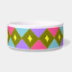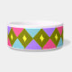 Esta incrível tigela de estimação tem um padrão de abstrato com filas de diamantes rosas e azuis. Cada fileira é separada por uma fileira de diamantes verdes escuros. Cada um dos diamantes verdes escuros tem um buraco no meio dele. Aqui está a parte divertida, você pode preencher aquele buraco com uma escolha de mais de 200 cores para fazer um design único. Aqui os buracos foram preenchidos com uma bela cor amarela como exemplo. Para selecionar sua cor e ver o efeito que ela tem no design simplesmente clique no botão "personalizar", vá para a seção de cores e clique no plano de fundo e escolha a cor que você quiser colocar no design. Você pode tentar tantas cores quantas quiser até encontrar a que funciona para você.