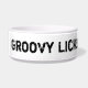 Apresentar "Groovy", a mascote musical compo inteiramente de notas musicais e de símbolos. A mensagem lê: Groovy lambe. Você pode personalizar a mensagem para ser seu nome de animais de estimação. Dê a seu animal de estimação o tratamento da estrela do rock com esta bacia musical.